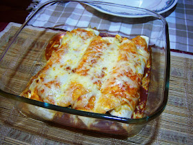 Which is how I came about cooking enchiladas at home. Helped by the fact that I found a pack of burritos and enchilada sauce in the local "gourmet" store. I have made sauce for enchiladas from scratch before and it really isn't difficult but this time I went with some outside help because I was pressed for time. (you can increase the quantity of chopped tomatoes and add a cup of salsa)