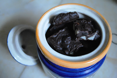 My own stash of indulgence - chocolate fudge seems so much more decadent than just chocolate. The creamy combination of butter, chocolate and nuts is exquisite! The original recipe from Nigella Express has pistachios in it; I used macadamia nuts since I had them left over from my trip to Australia - but feel free to use the nuts you like. Plus I added dried currants. Not much can go wrong when you combine chocolate, fruit and nuts.